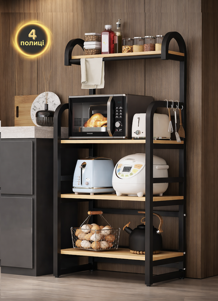 Чотири полиці забезпечують зручне розміщення техніки, посуду, книг і аксесуарів.
